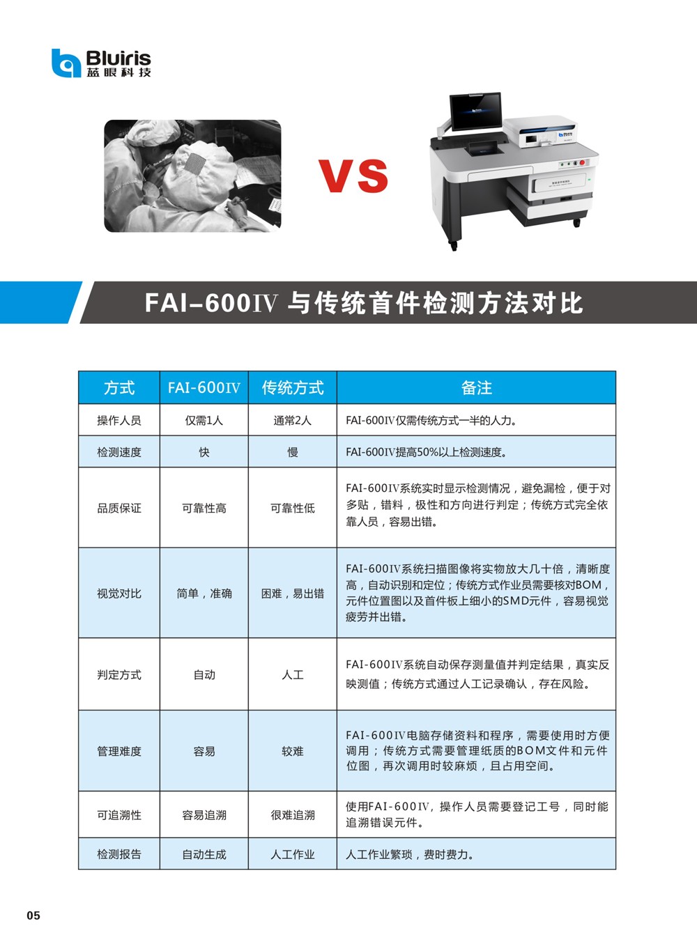 當(dāng)今SMT電子工廠,多機(jī)種、小批量、換線頻,使得首件檢測(cè)的任務(wù)越發(fā)繁重。傳統(tǒng)的SMT首件檢測(cè)方法,不僅浪費(fèi)人力,效率低下,整個(gè)首件檢測(cè)過程缺乏管控,品質(zhì)難以得到保證。針對(duì)此難題,深圳市藍(lán)眼科技有限公司首創(chuàng)了SMT首件檢測(cè)儀,通過不斷升級(jí)優(yōu)化,現(xiàn)已研發(fā)出第四代首件檢測(cè)儀FAI-600IV,具有以下顯著優(yōu)勢(shì):